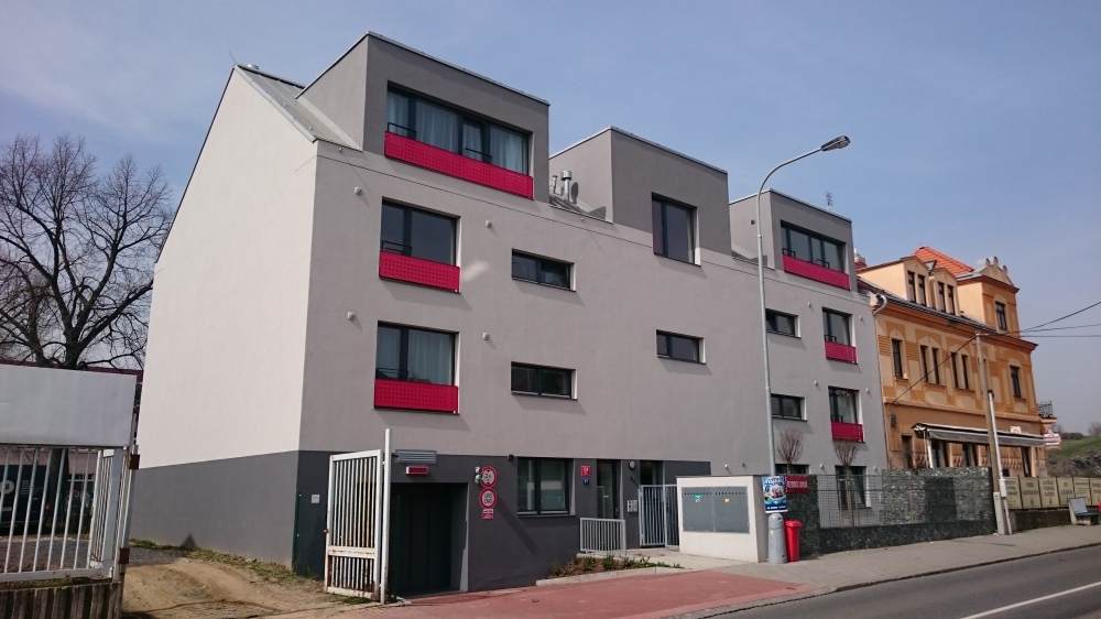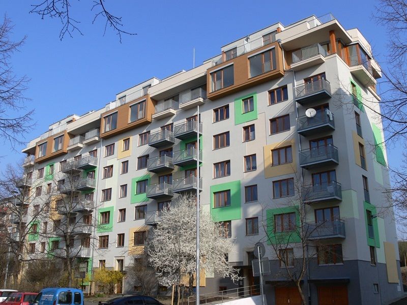 U bytového domu Libocká byla provedena imitace klasické plechové krytiny na šikmé střeše s využitím fóliového systému, jehož součástí je i dodávka tzv. pohledových falců, které se na hotovou fóliovou krytinu dodatečně navařují v požadovaných vzdálenostech, aby byla střecha fóliová pohledově co nejvěrnější střeše plechové. Tato fóliová krytina má výhodu ve větší těsnosti než střecha plechová a její použitelnost není tedy omezena ani menšími sklony např. u vikýřů (viz foto) na které již plechová krytina nelze použít.