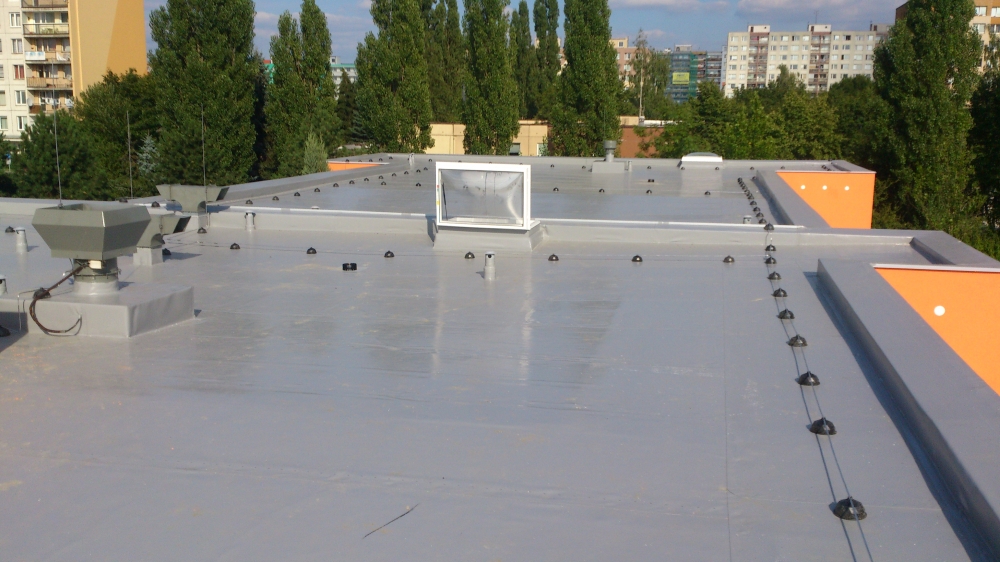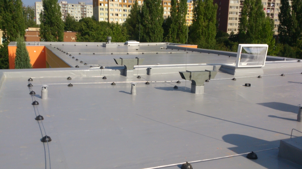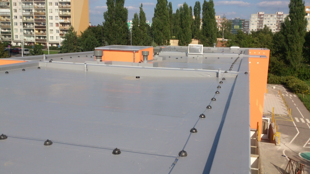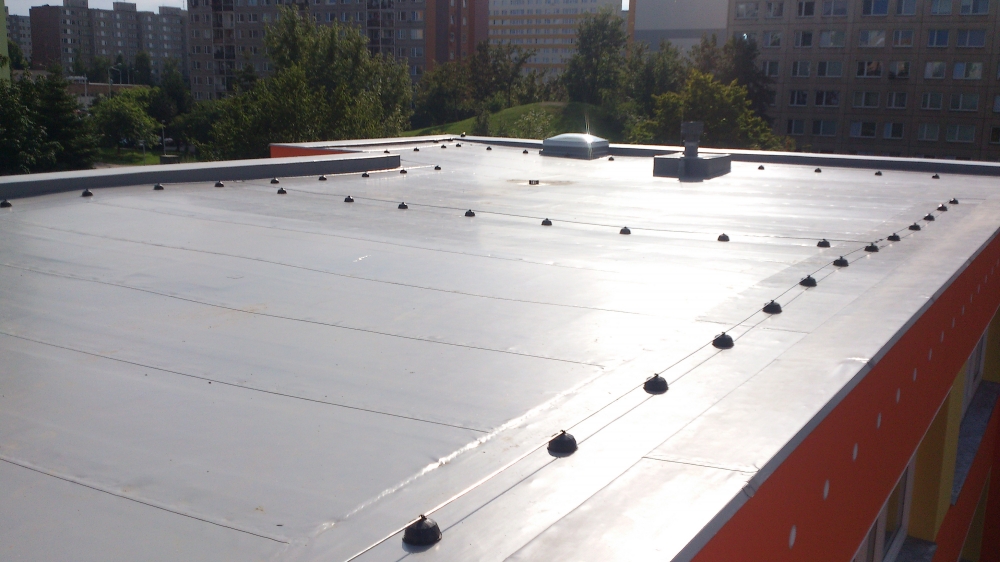 Kompletní rekonstrukce poché střechy mateřské školy 1.234 m2. Jako hlavní byla použita hydroizolace mPVC Rhenofol CV 1,5 mm.